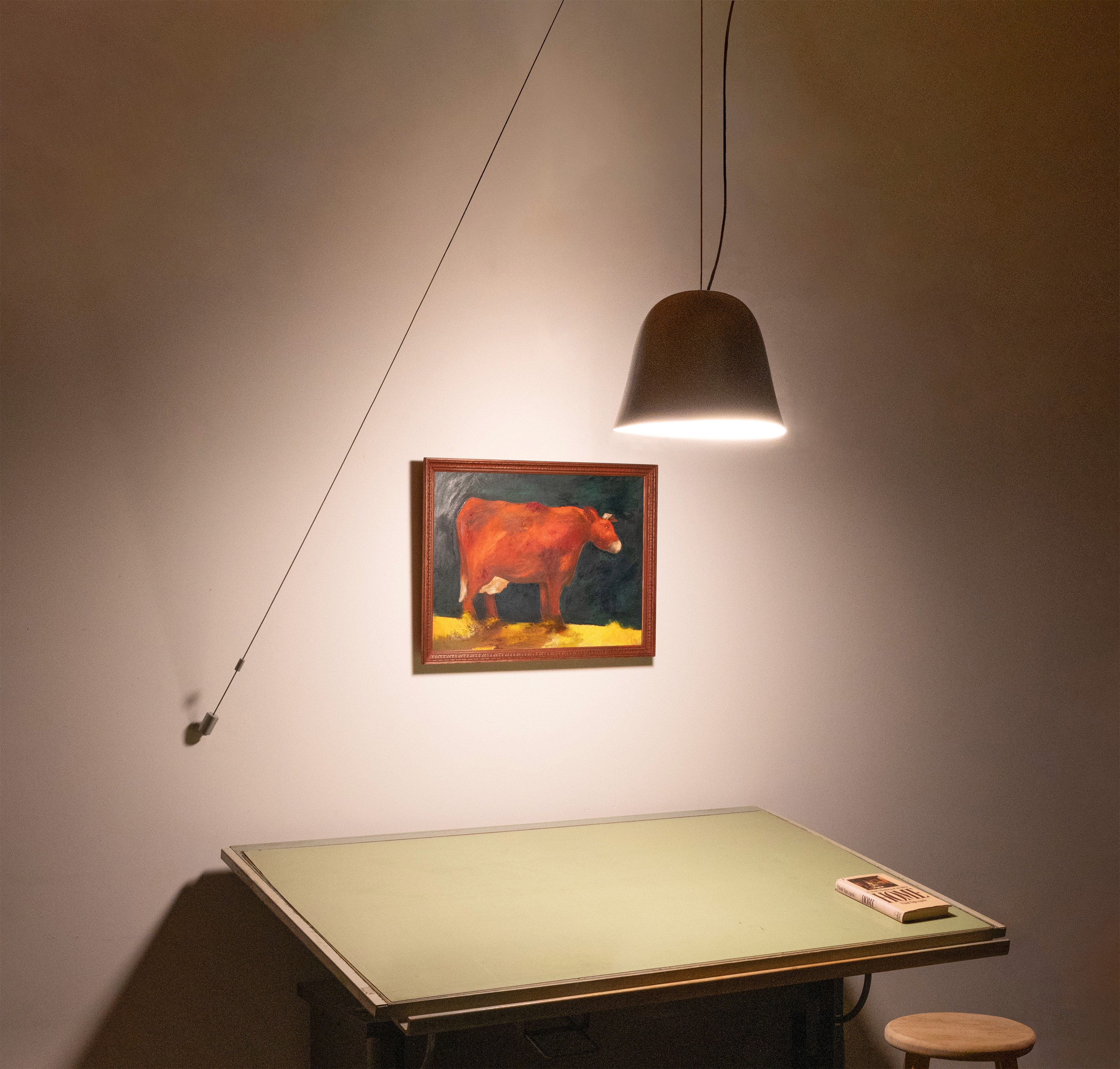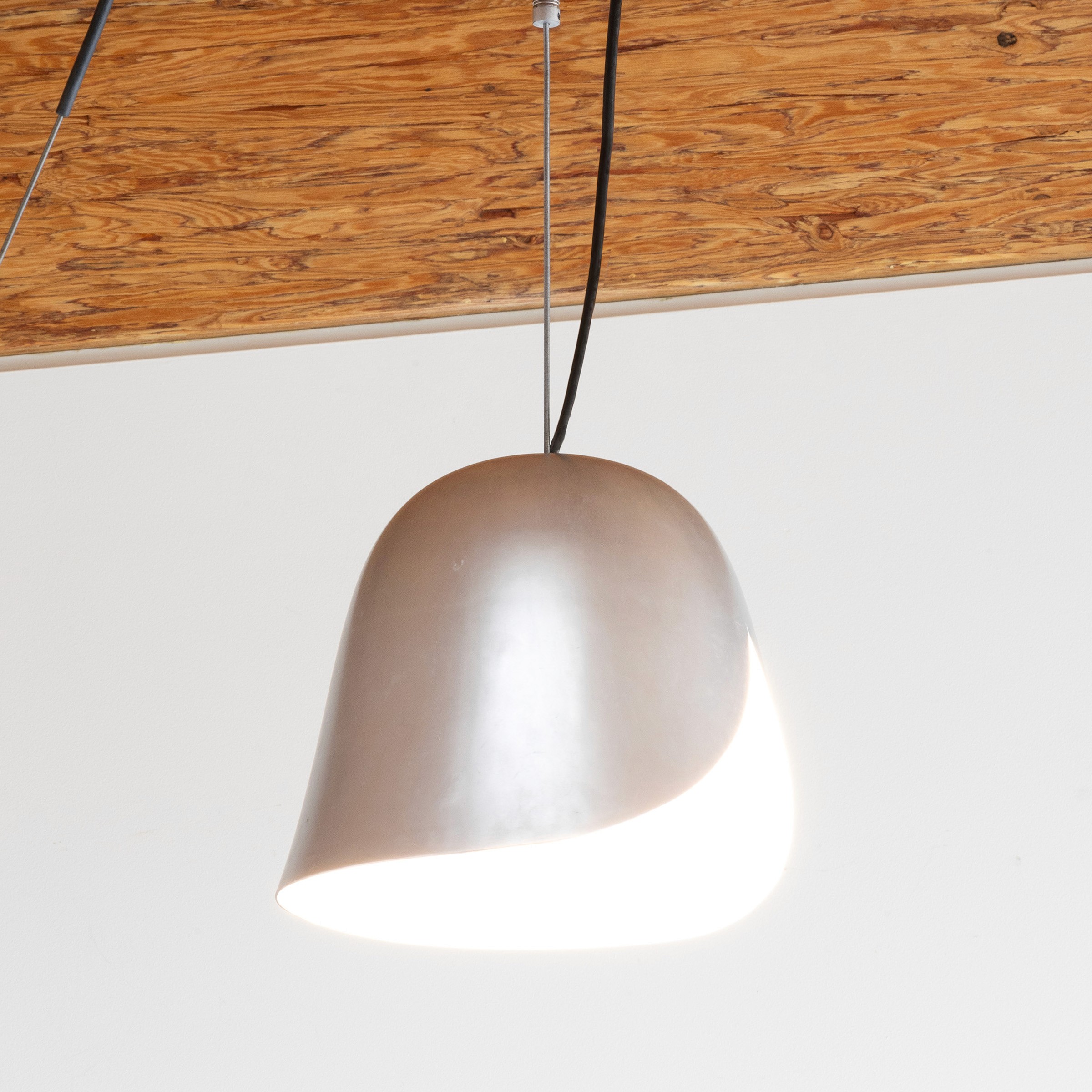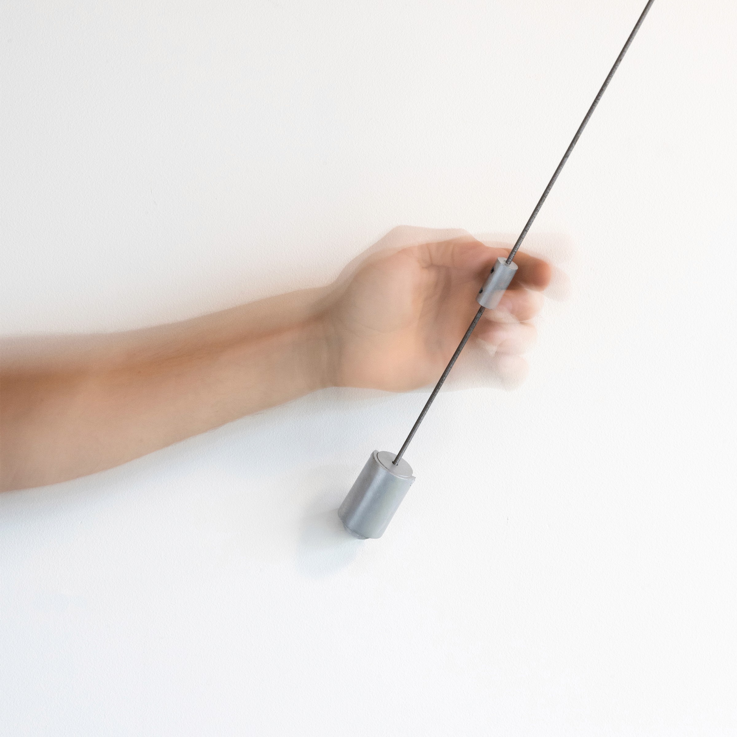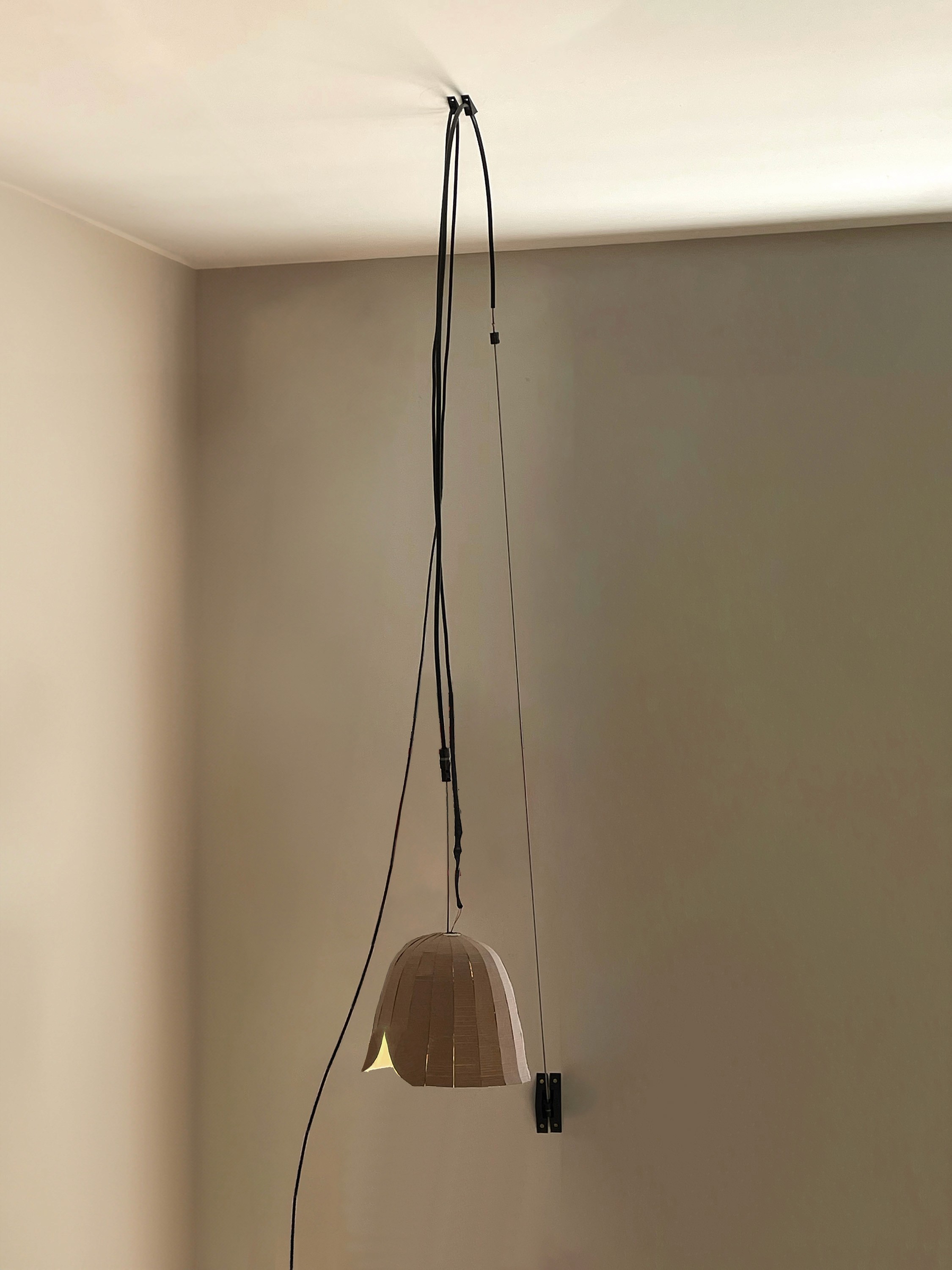 As mathematical a proof explains the argument of a math statement, the Proof Light's visible and connected mechanisms spell out its rotating function. The Proof lamp is spun remotely by the rotation of the cable it hangs from, meaning users can turn the lamp to project illumination on different parts of the room. The effect in practice is both a pleasant tactile experience, as well as a channeling of the user’s focus, illuminating small areas as if they were independent spaces themselves.